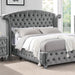 Showcase your personal taste with this bold statement piece in your bedroom. Fully upholstered in flannelette, this bed features an oversized wingback headboard with eye-catching tufting and lined with nailhead trim. The padded fabric and crystal buttons continue all throughout the bed frame and the matching case goods. Each drawer handle is made of glistening acrylic crystals, while silver-painted cabriole legs are perfect in bringing in majestic vibes that this ensemble set out to do.