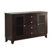 Daisy Collection combines superb visual appearance and fine quality that you need in your dining area. The server creates a functional storage space - behind glass doors display shelves and drawers - for your tabletop items. Brushed nickel hardware knobs front the unit. The set is constructed of hardwood solids and veneers in a refreshing espresso finish. 52 x 18 x 36H