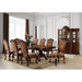 Add elegance to your dining area with this beautifully carved table and hutch. The table has two pedestals and matching padded chairs. The hutch has dramatic carvings, hardware and plenty of display space.