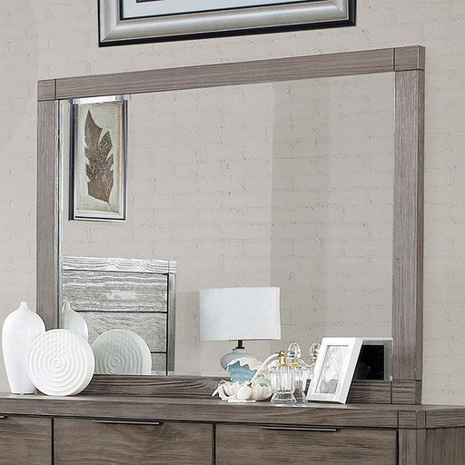Berenice Gray Mirror, 38"W X 1 1/8"D X 38"H, 29.48lbs. Transform your bedroom with this transitional style mirror. Built with solid wood and wood v...
